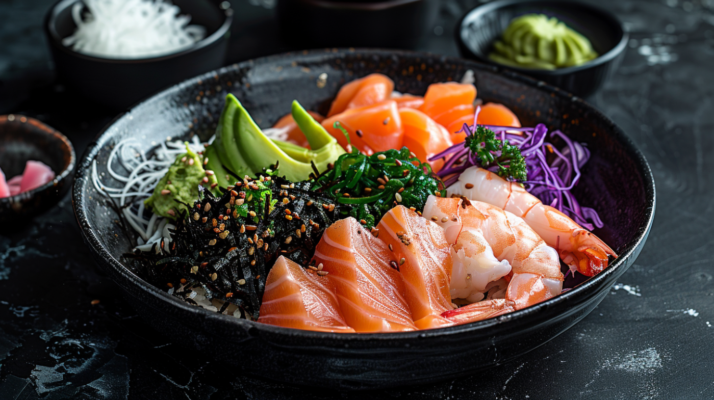 Alla sashimi menyer innehåller tillbehören: Salladsmix, kimchi, wakamesallad, ingefära, wasabi och sesamfrön.